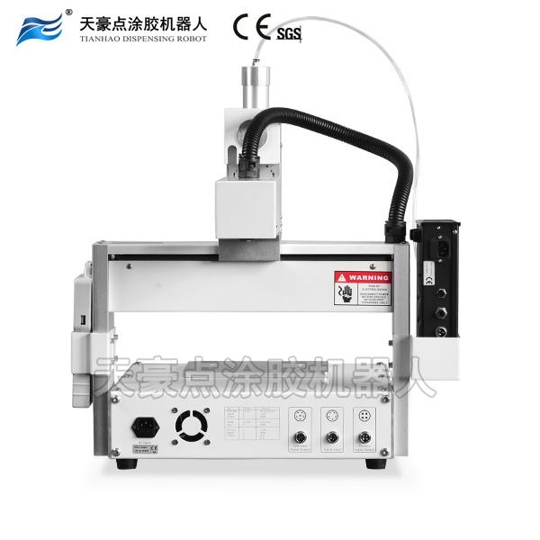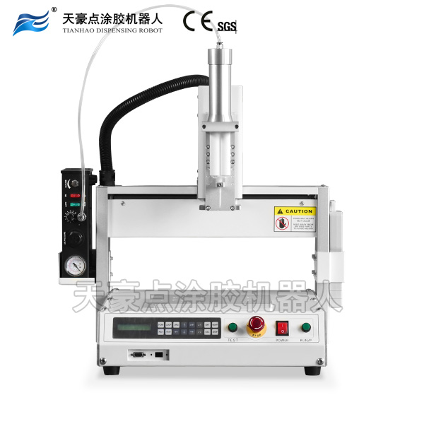 機(jī)器搭載50ml針筒式雙組份膠專用精密膠量控膠系統(tǒng)以及懸浮型機(jī)械手結(jié)構(gòu),一般適用于固定體積比例1:1,2:1,4:1,10:1的50ml針筒式包裝的AB雙液膠的產(chǎn)品點(diǎn)涂膠,其可代替人工在各種平面或曲面的產(chǎn)品上進(jìn)行高精度微量的雙液快速打點(diǎn)、畫線、畫圓等自動(dòng)點(diǎn)涂膠作業(yè)。